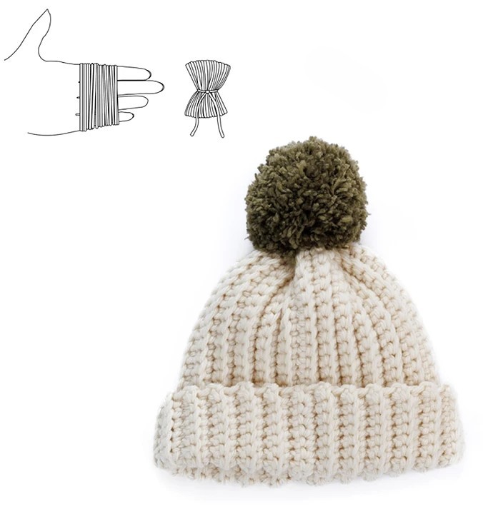 Pompom: Wind B around 4 fingers 150 times. Tie tightly in the middle and leave a long end for attaching to Hat. Cut loops at both ends and trim to smooth round shape. Sew securely to top of Hat as shown in photo.