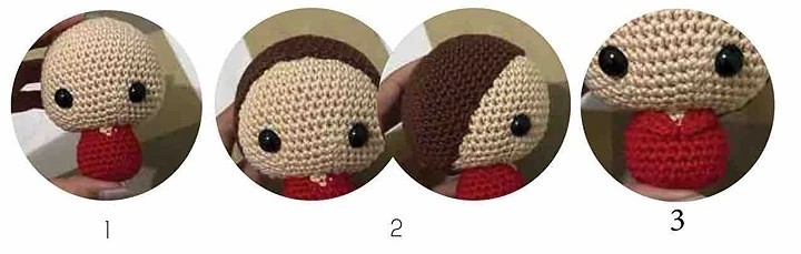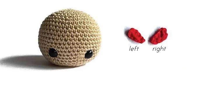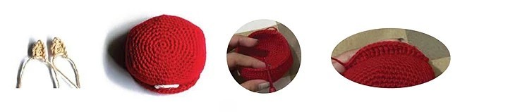 R10: (dec, 2sc) x2, dec, sc, (change to beige) sc, (change to red) (dec, 2sc) x3 [18]