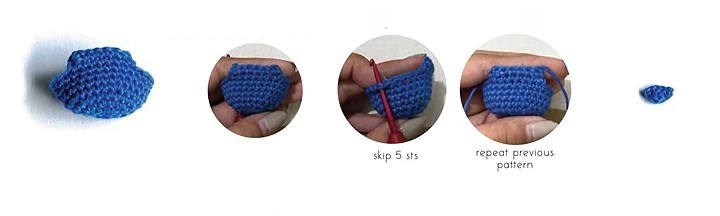 R5: (crochet into the back loops of R3) (change to blue) 5sc, sk 1 st, 5sc, sk 1 st [10]