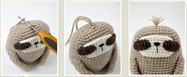 Make a tuft on the sloth’s top head. Take a piece of main yarn and make a loop with the help of the hook under the first row. Cut the ends of the thread at the desired length and fluff the ends.