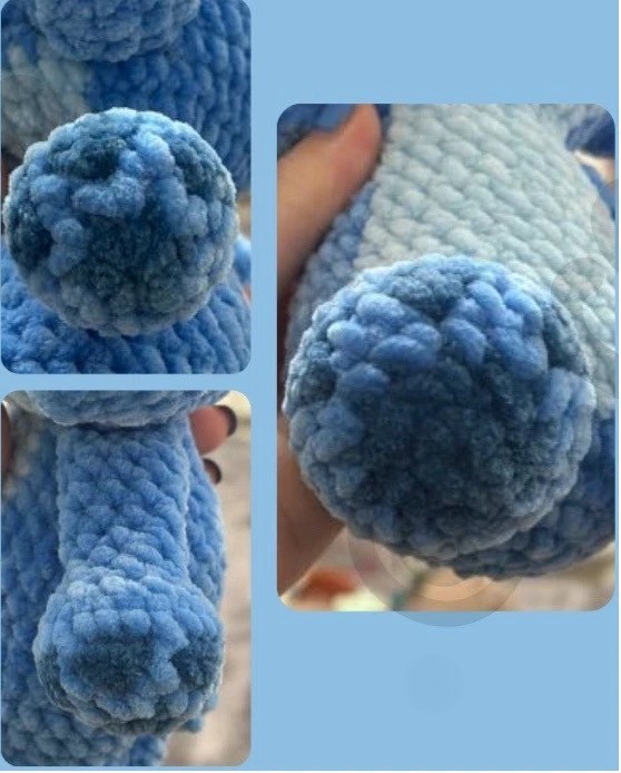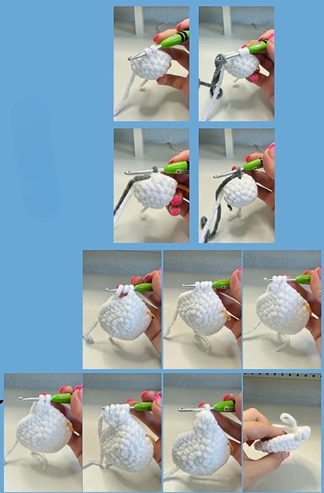 R1 sc around 12 in the first leg and 12 in the second (24)