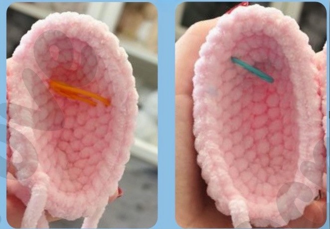 With your yarn still connected place the inner ear inside of the outer one and sc through both pieces. When you reach your stitch marker marking the front loop crochet through the outer ear and into the front loop to create an indent. Leave a tail for sewing. Sew the bottom three stitches together. Repeat for the second ear.