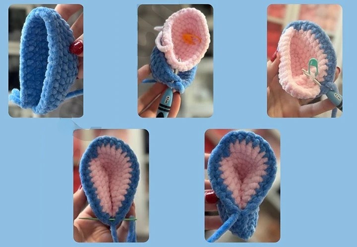 Sew three stitches down the side of the ear, sew the base of the ear lined up with the last round of light blue, and secure half way up the ear down to the head.