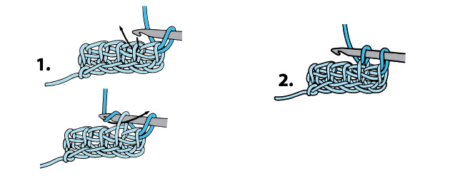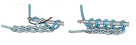 Return pass: (Left to right after working Forward pass of each row). Yoh, draw through 1 loop on hook, *yoh, draw through 2 loops on hook; repeat from * until 1 loop remains on hook.