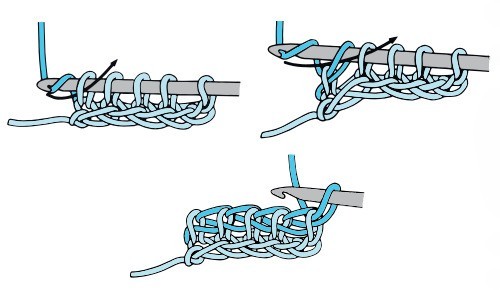 2nd row Return pass: (Left to right after working Forward pass of each row). *Yoh, draw through 2 loops on hook; repeat from * until 1 loop remains on hook.